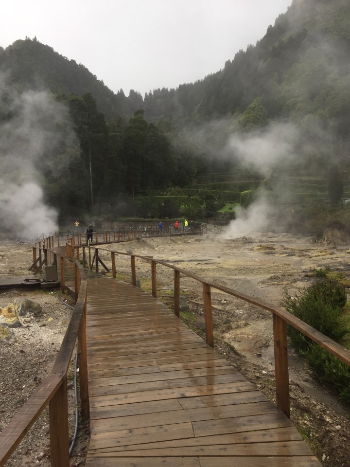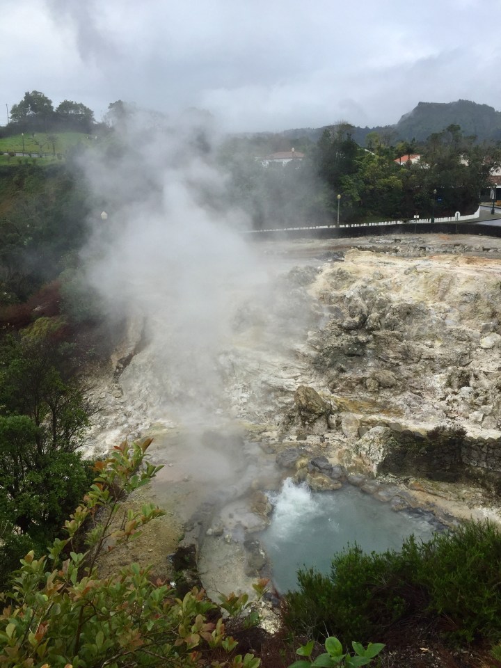 Wulkaniczny dzień Sao Miguel: mineralne kąpiele i lunch, czyli atrakcje zapewniane przez wulkan Furnas, leżący we wschodniej części wyspy. Trzeba dojechać do miasteczka o tej samej nazwie i można wybierać. Z jednej strony tropikalny, zielony park założony wokół dymiących fumaroli (i kilku pastwisk). Wyziewy z wnętrza ziemi skutecznie walczą z nutami obornika, a ja ogromnie podziwiam miejscowych – bo fumarola w ogródku, brzmi fajnie, ale konsekwencje olfatyczne nie do oszacowania. Po prawdzie, nie są to jedyne problemy zwiazane z mieszkaniem na Wyspach Szczęśliwych, bo Furnas to wulkan drzemiący, ale w ubiegłym roku (czyli 2018) poważnie badano możliwość erupcji. Na Azorach to się zdarzało dość często.