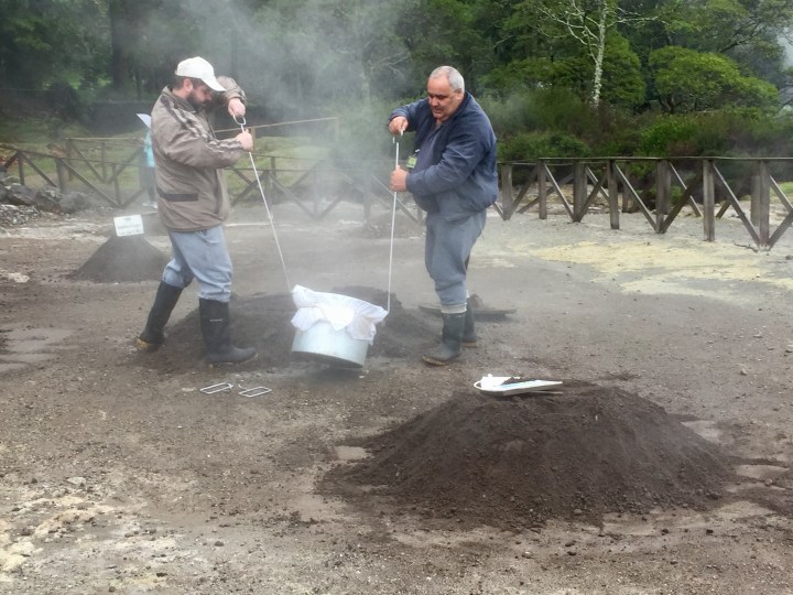Czas na lunch, czyli kolejna miejscowa atrakcja: gulasz cozido duszony w gorących źródłach. A konkretnie różne rodzaje mięs (dużo dość tłustej wieprzowiny) chorizo, kawałki kaszanki oraz warzywa: ziemniaki, rzepa, marchewka, kapusta i jarmuż lądują w wielkim garze. Ten gar wkłada się do betonowej tulei wkopanej w gorącą ziemię, tuż przy gorących źródłach nad jeziorem Lagoa das Furnas. Potrawa dusi się przez około 5 godzin by o 12.30 zostać wykopaną z kopca w asyście zachwyconych turystów oraz drzemiących w ciepłym błocie kotach i gęsiach – bestie razem jak powinno być w raju.
