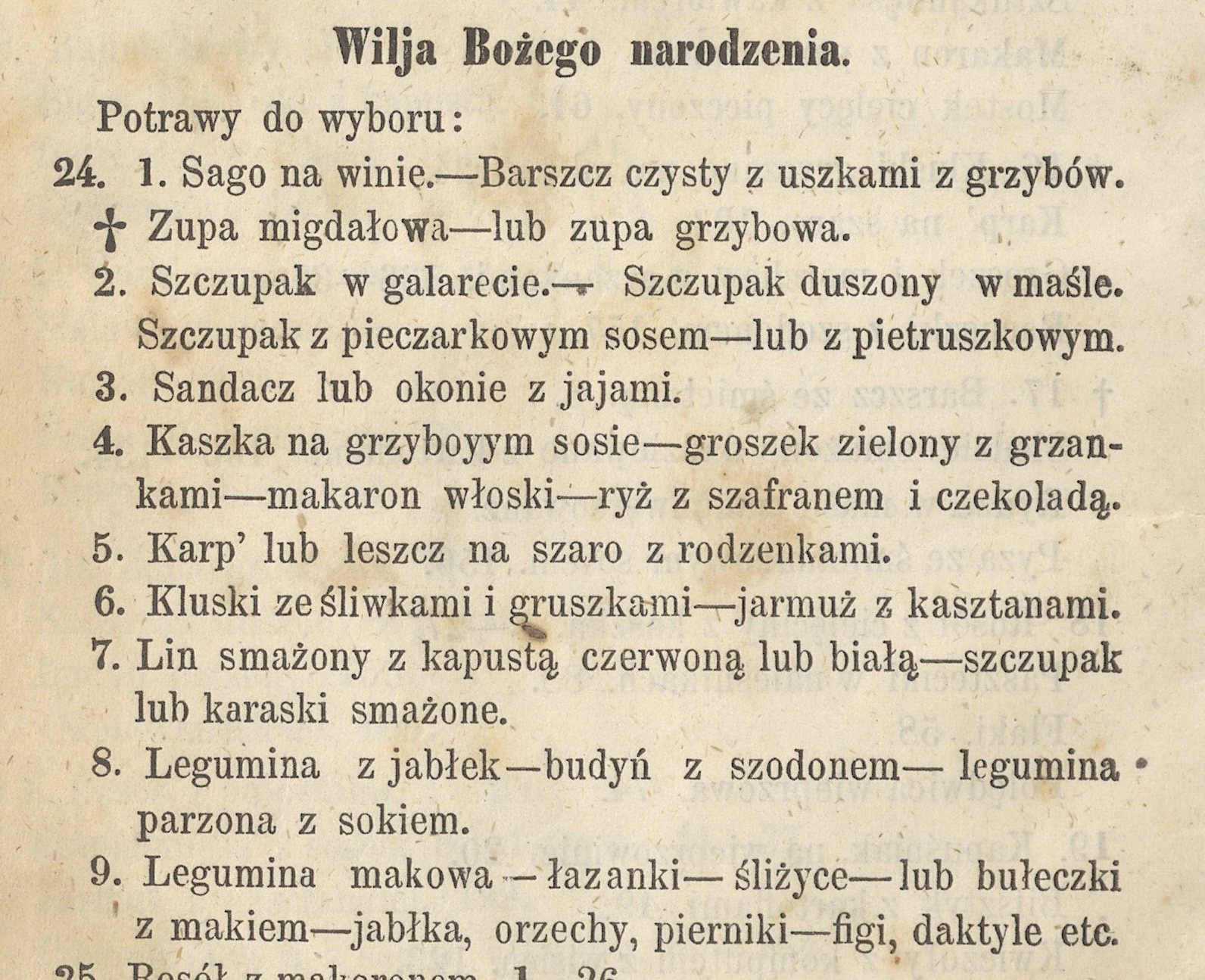 Współcześnie uważa się, że na stole wigilijnym powinno znaleźć się dwanaście potraw. Ćwierczakiewiczowa podaje listę potraw do wyboru (9 punktów), z których gospodyni miała skomponować kolację. Interesujące jest jednak to, co na tej liście się nie znalazło, a co dziś uważamy za najbardziej tradycyjne z tradycyjnych smaków wigilijnych.