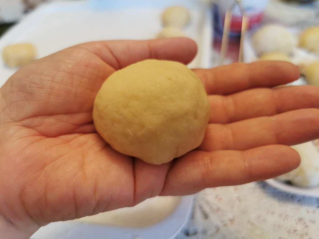 5. Formuj pączki: Wyłóż ciasto na stół posypany mąką i lekko rozwałkuj na grubość około 1 cm. Wycinaj szklanką placuszki, a następnie układaj każdy z nich na dłoni i nakładaj na środek porcję konfitury. Sklej starannie krawędzie ciasta, tworząc kształt sakiewki i delikatnie uformuj w dłoniach zgrabną kuleczkę. Zwróć uwagę, aby nadzienie szczelnie zamknąć w środku. Gotowe pączki układaj na blacie oprószonym mąką, kierując miejsce sklejenia do dołu.