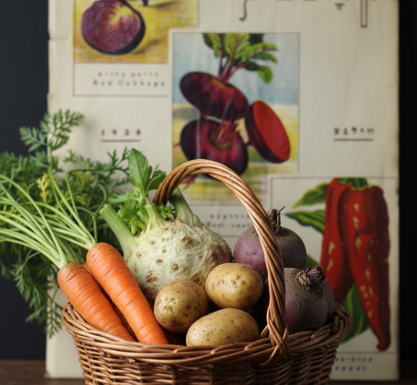 Zdjęcie wygenerowałam w Nano Banana używając strony tytułowej książki Fani Lewando „Wegetariańsko-dietetyczna książka kucharska. 400 przepisów przygotowanych wyłącznie z warzyw” ze zbiorów Polony, czyli cyfrowej Biblioteki Narodowej.