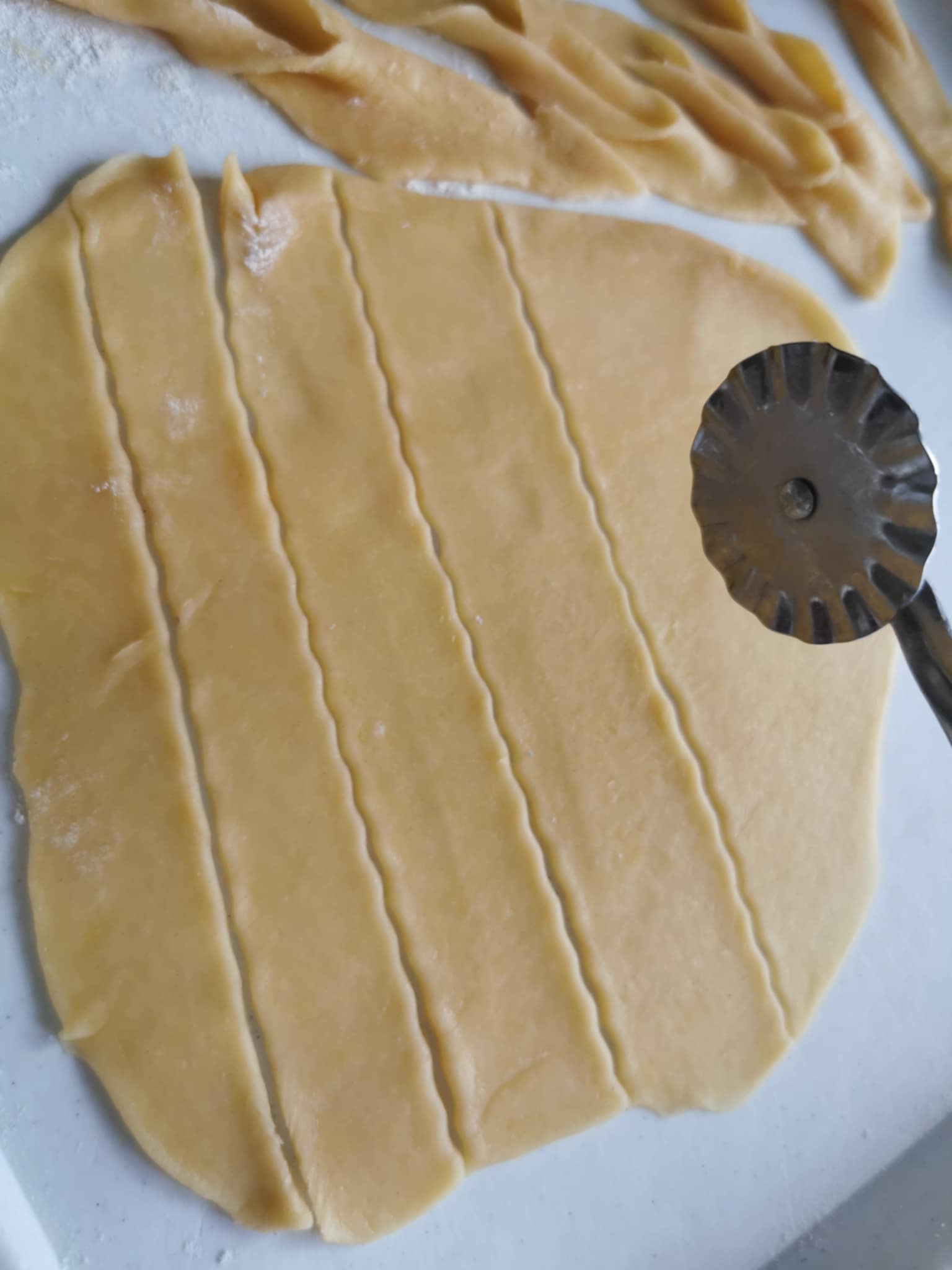 - Wykrawaj i formuj: Za pomocą noża lub radełka wytnij pasy o szerokości ok. 3 cm, a następnie podziel je ukośnie na mniejsze paski o długości 10–14 cm. Na środku każdego paska zrób nacięcie (ok. 7 cm) i przełóż przez nie jeden koniec ciasta. Uformowane faworki odkładaj pod ściereczkę.