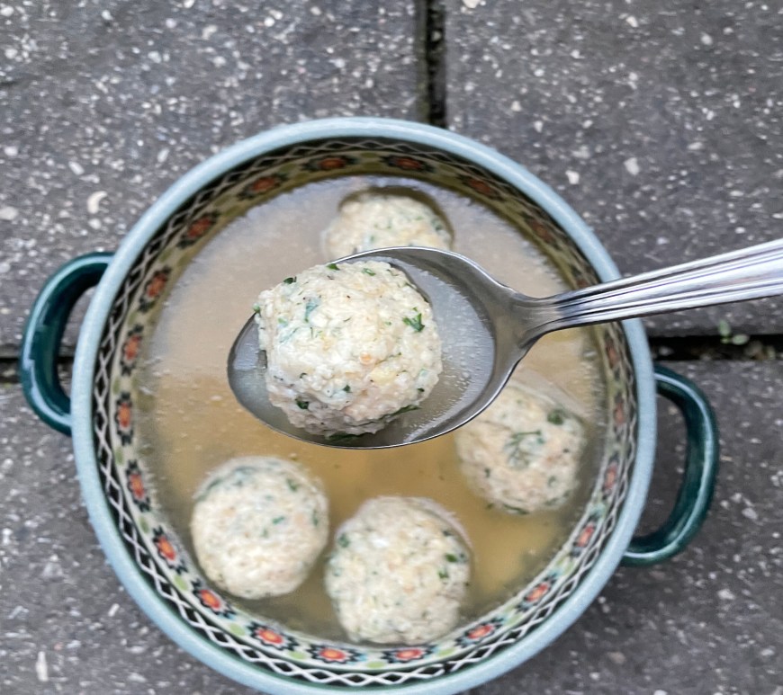 Knejdlech czyli okrągłe kluski z mąki macowej to klasyczne danie na święto Pesach. Przepisów na nie jest tyle, ile osób gotujących: niektórzy do ciasta dodają ubite białka a inni wodę sodową. Ciasto z mąki macowej bywa przyprawiane czosnkiem, a ja proponuję dużo zieleniny: pietruszki, koperku i lubczyku oraz przyprawy, takie jak do bulionu warzywnego.    Składniki: na bulion warzywny: marchewki pietruszki selery olej do smaku: … Czytaj dalej Warzywny bulion z knejdlech (kulkami macowymi)